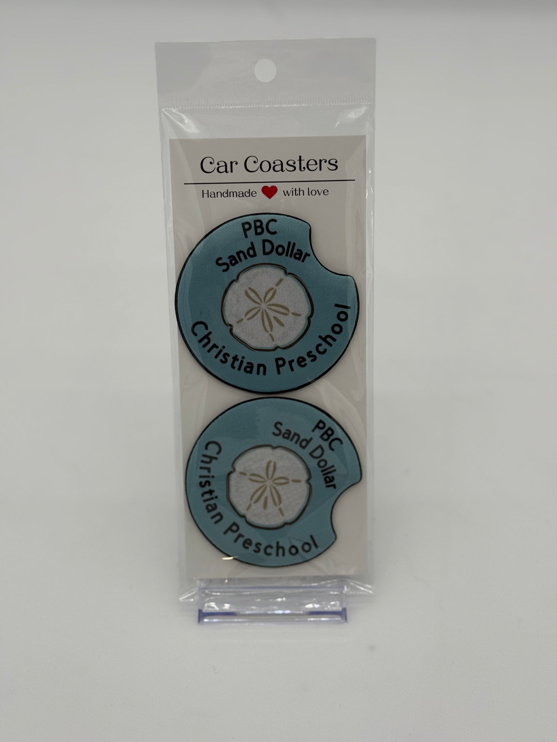 Add a touch of charm to your car while supporting a cause that matters. This set of two foam car coasters features a soft blue background with a white sand dollar and the name of PBC Sand Dollar Christian Preschool encircling the design. Professionally printed and packaged, these coasters are made to fit standard car cup holders — helping absorb drips and keep your ride tidy, all while celebrating faith, community, and early learning.